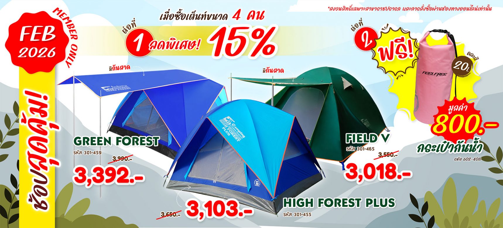 ตั้งแต่ 1-28 กุมภาพันธ์’69 เฉพาะสมาชิกสโมสรสื่อเดินทาง ซื้อ1หลัง ได้รับส่วนลด 15% และแถมฟรี.กระเป๋ากันน้ำ20ลิตร รหัส 602-408 จำนวน1ใบ